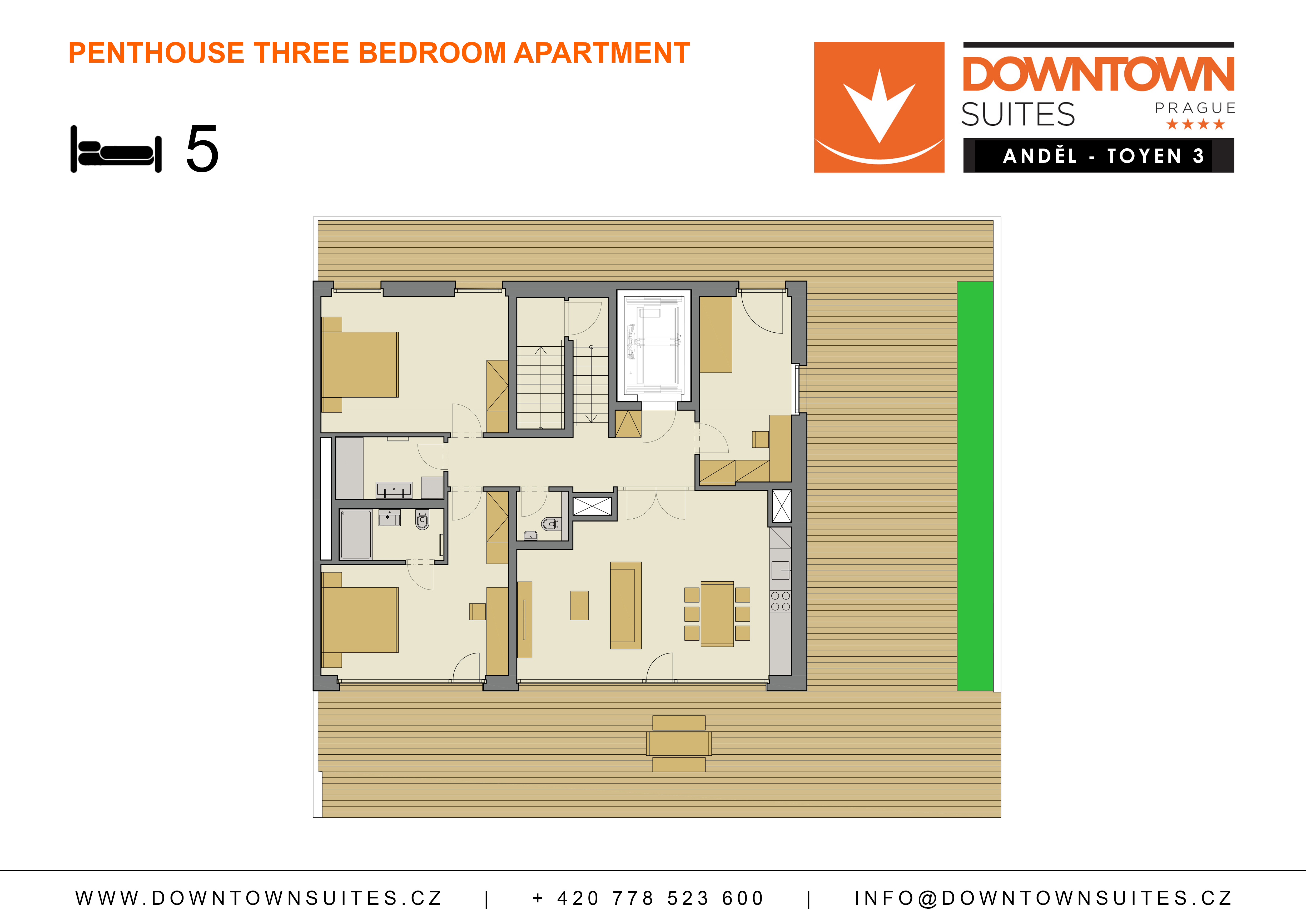 This Fully Air-Conditioned Penthouse Three Bedroom Apartment with Terrace is suitable for max 5 people and features: 2× king size bed + 1× single bed | 2× private bathroom with toilette – 1× bath tub + 1× shower | fully equipped kitchen with kettle, microwave, stove top, oven, fridge, dishwasher, dishes and cuttlery | dining table | living room with seating area | smart SAT TV | free Wi-Fi | wardrobe | iron with ironing board | linens and towels | hairdryer and toiletries | terrace with seating.