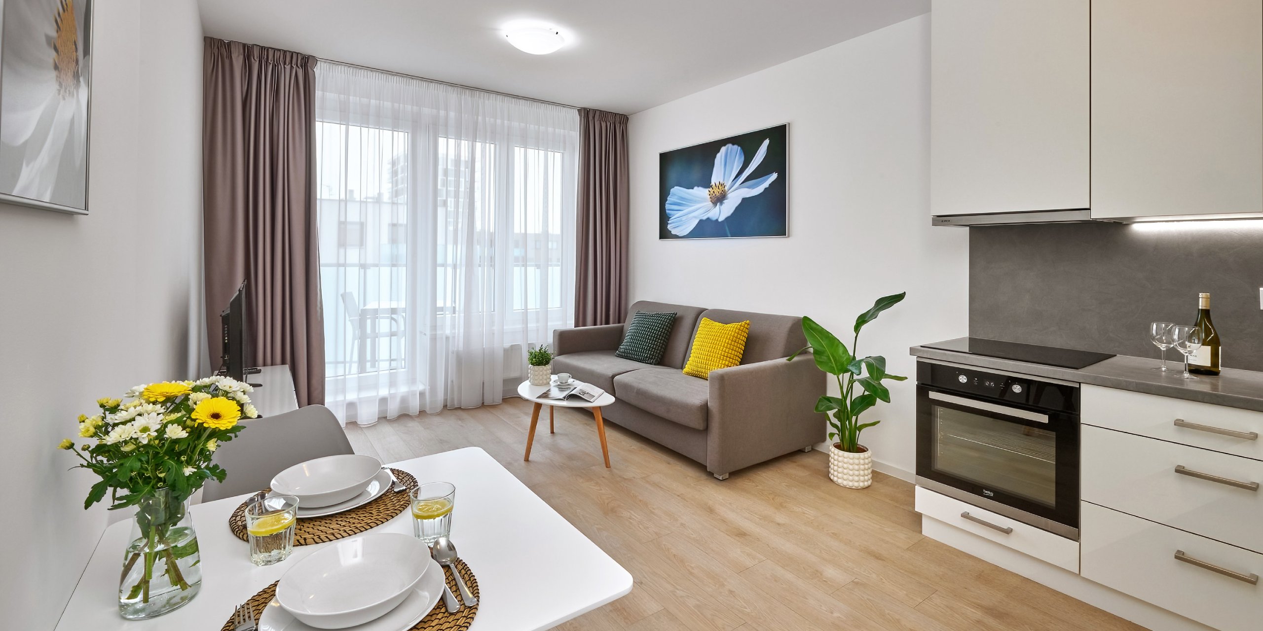 This One Bedroom Apartment with Balcony is suitable for max 4 people and features: king size bed | private bathroom with bath tub and toilette | fully equipped kitchen with kettle, microwave, stove top, oven, fridge, dishwasher, dishes and cuttlery | dining table | seating area with comfortable sofa bed | smart SAT TV | free Wi-Fi | wardrobe | iron with ironing board | linens and towels | washing machine, hairdryer and toiletries | balcony with seating.
